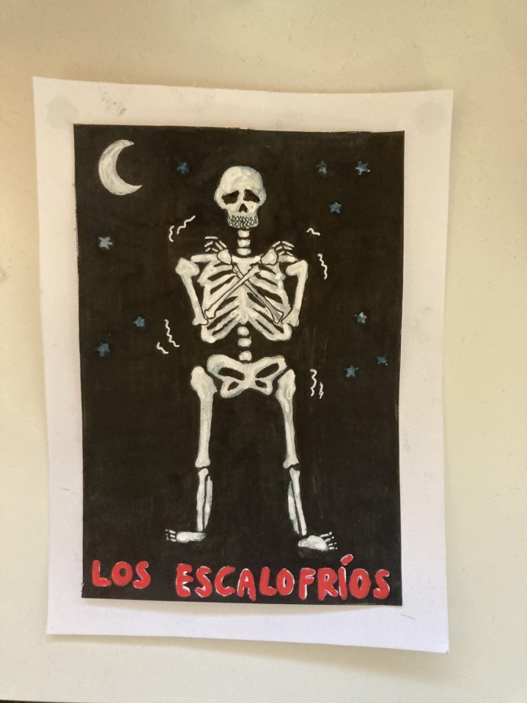 Fort Lewis College student Taylor Sinclair learned the word escalofríos. She decided to create an image similar to that of the Mexican lotería to show a skeleton with escalofríos, or chills.